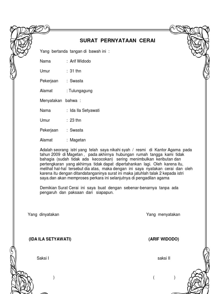 Surat Talak Contoh Surat Cerai Tulisan Tangan Nusagates from cdn.statically.io Check spelling or type a new query. Surat perjanjian perceraian download surat perjanjian perceraian download format surat lain: Namun surat pernyataan cerai atau surat keterangan cerai juga bisa dikeluarkan oleh pihak yang berwenang, seperti ketua rt ataupun pihak berwenang lainnya. Surat pernyataan memang tidak hanya dibuat oleh kedua belah pihak, yakni suami dan istri yang bercerai saja. Oleh karena itu kemudian jalan yang diambil adalah perceraian. Contoh surat kuasa untuk roya surat riwayat. Contoh surat cerai istri kepada suami. Contoh surat perjanjian kerjasama diperlukan untuk anda yang ingin membuat surat perjanjian bisnis.